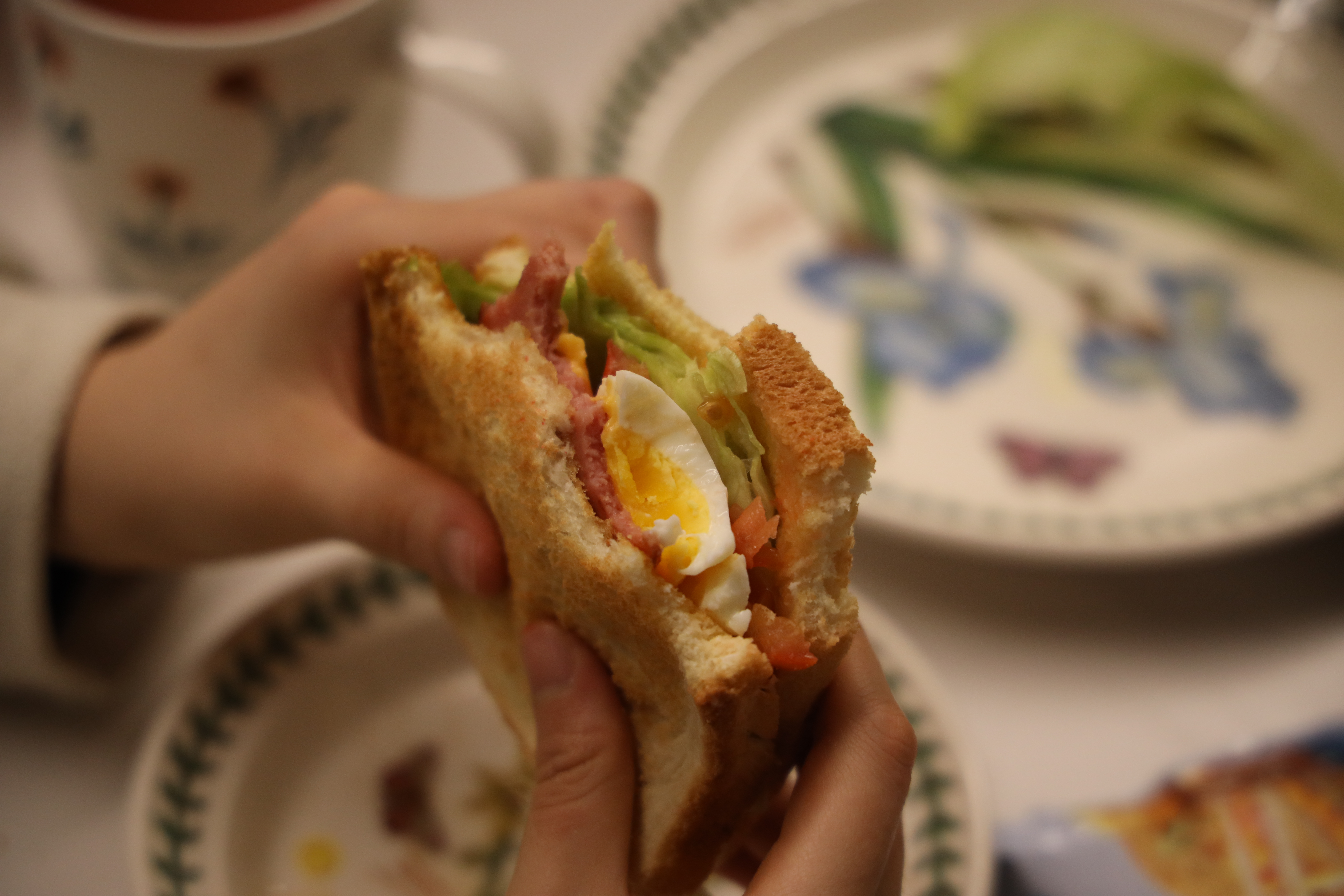 넓은 잔디밭에 돗자리를 깔고, 집에서 만들어온 토스트를 먹는