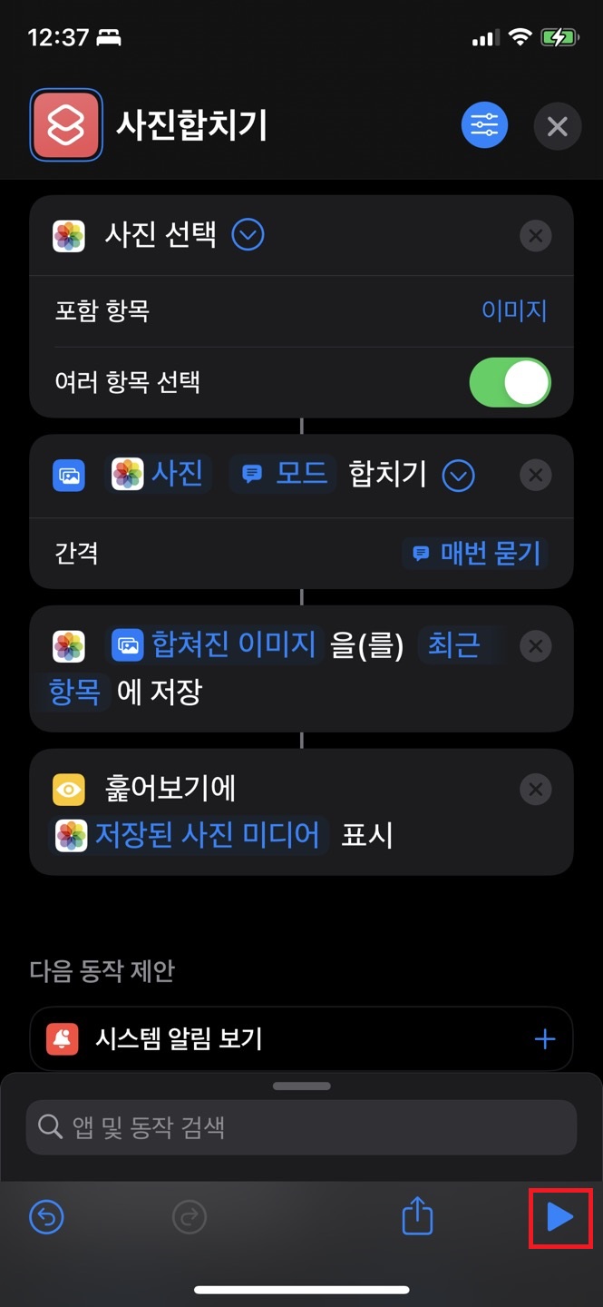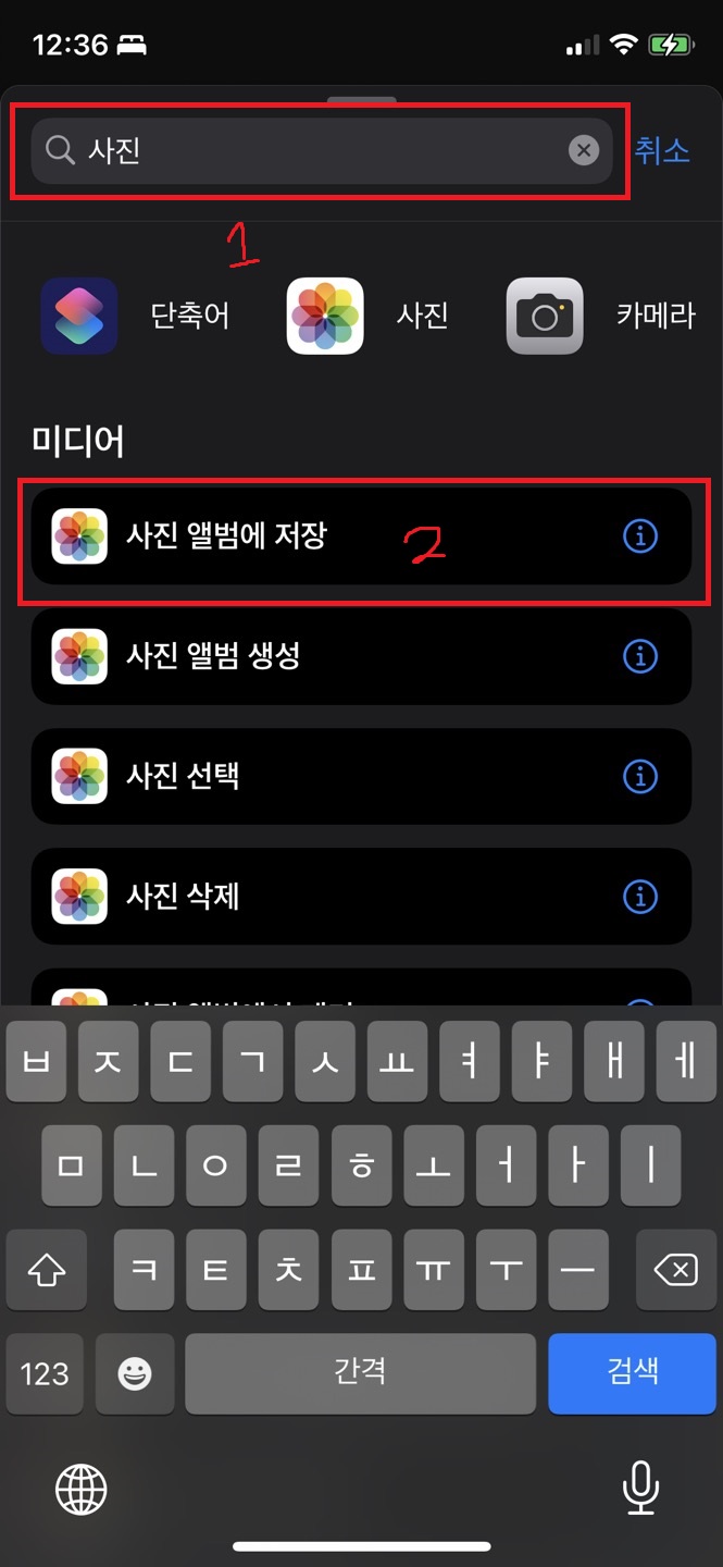 그리고 동작을 하나 더 추가하겠습니다. 사진이라고 검색하신 뒤에 '사진 앨범에 저장' 선택해줍니다. 이렇게 까지만 해주시면 사진이 합쳐져서 저장되는 단축어는 완성이 되었습니다.