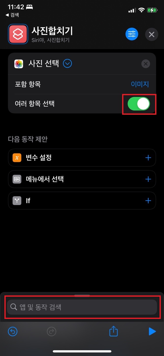 사진선택에서 '이미지'만 선택 될 수 있도록 선택해줍니다. 그리고 여러개의 사진을 변환 할 것이기 때문에 '여러 항목 선택'을 On으로 해줍니다. 그리고 아래 동작 검색을 터치하여 새로운 동작을 추가해줍니다.