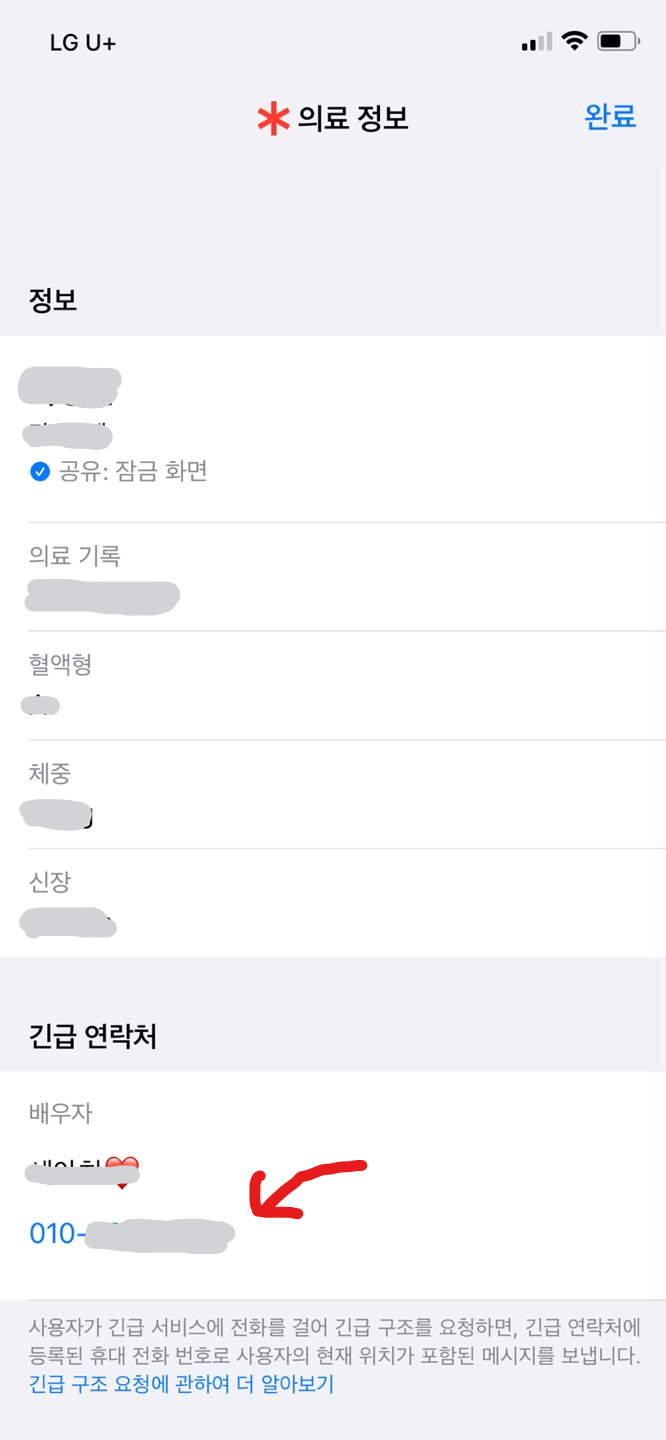미리 지정해둔 긴급 연락처로 연락을 하기 원할 경우에는 '의료 정보'를 슬라이드 하여 입력되어있는 긴급 연락처로 연락하여 조취를 취하시면 됩니다. 그렇기 때문에 긴급상황을 위한 연락처를 추가해주시는 것이 좋습니다.