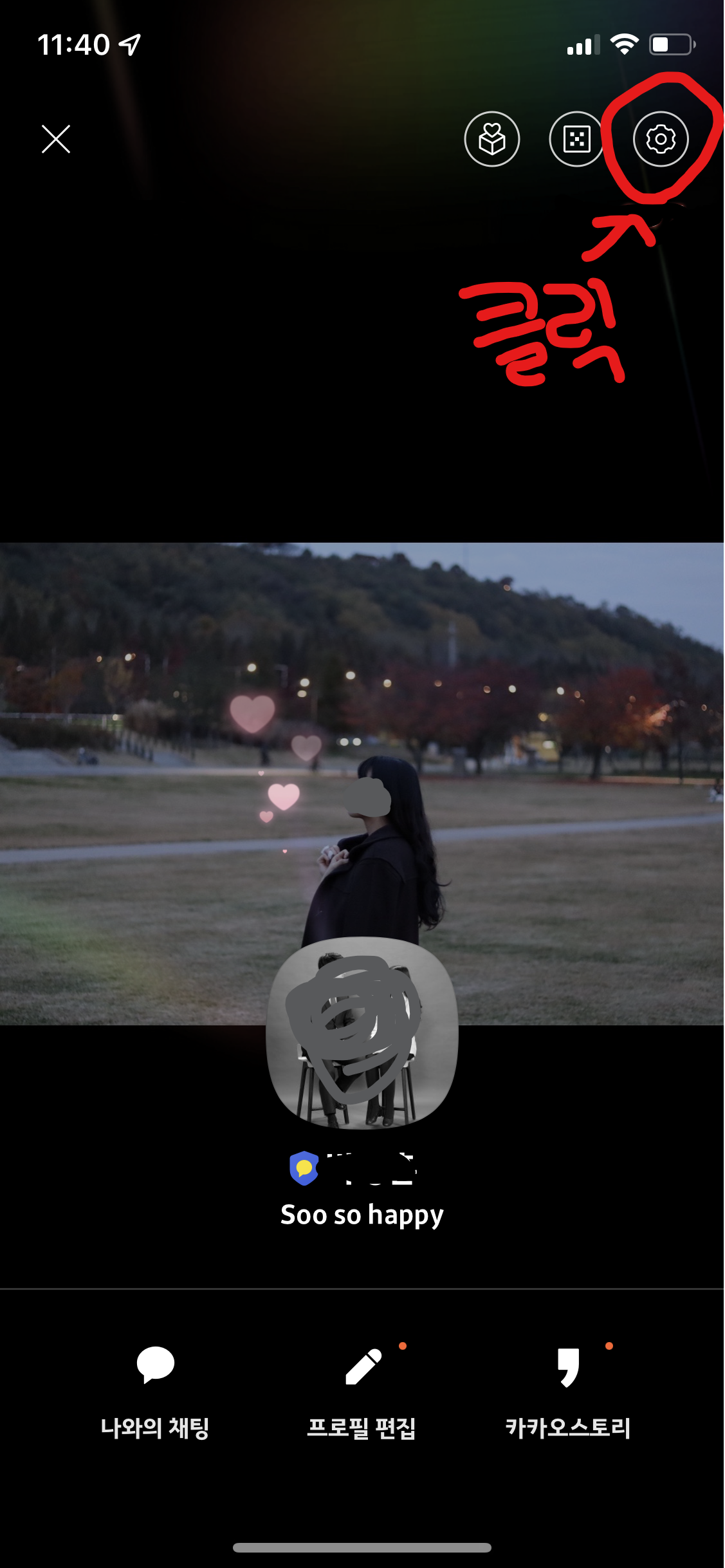 카카오톡 홈 화면에서 '나의 프로필'을 먼저 선택해줍니다. 그리고 우측 상단에 있는 '톱니바퀴 모양(설정)'을 선택하여 프로필 관리 탭으로 이동해줍니다.