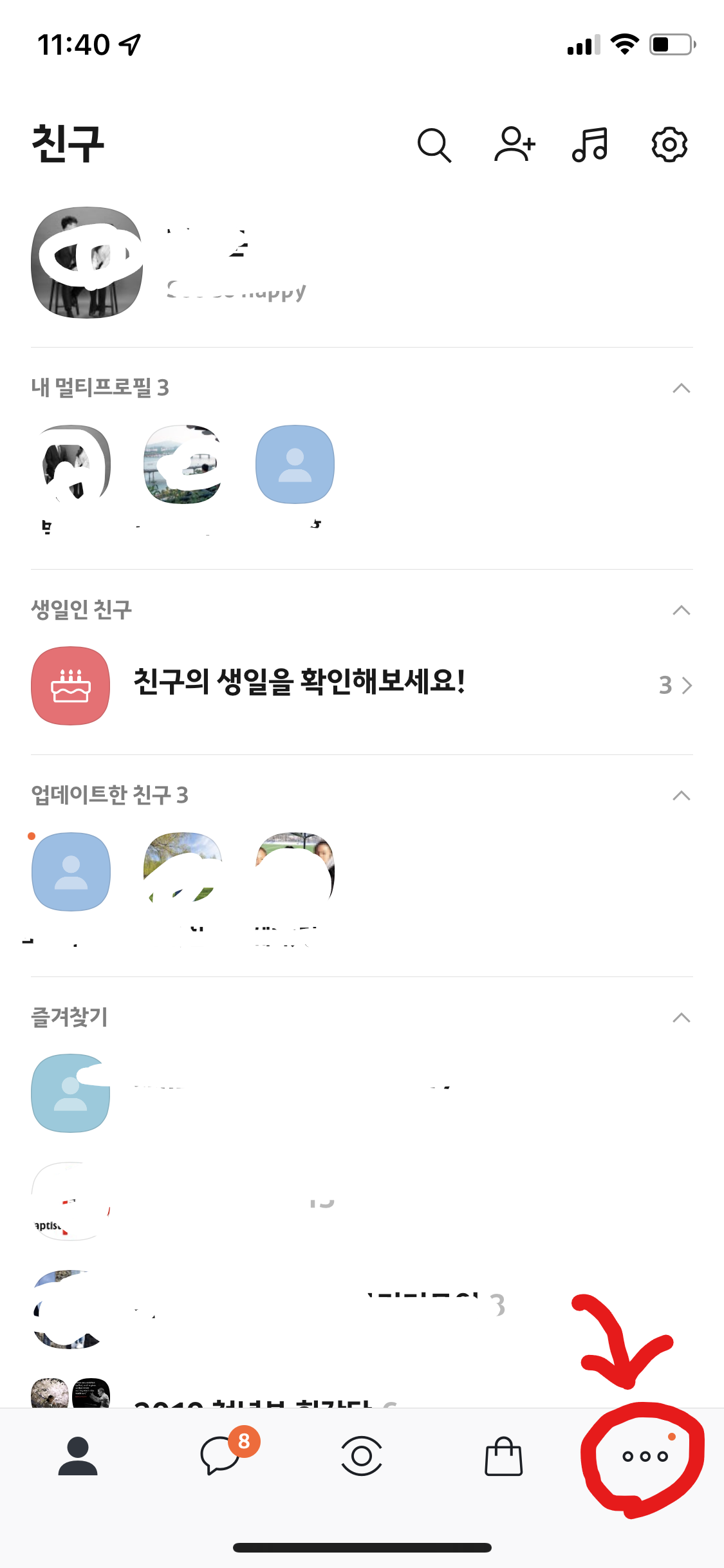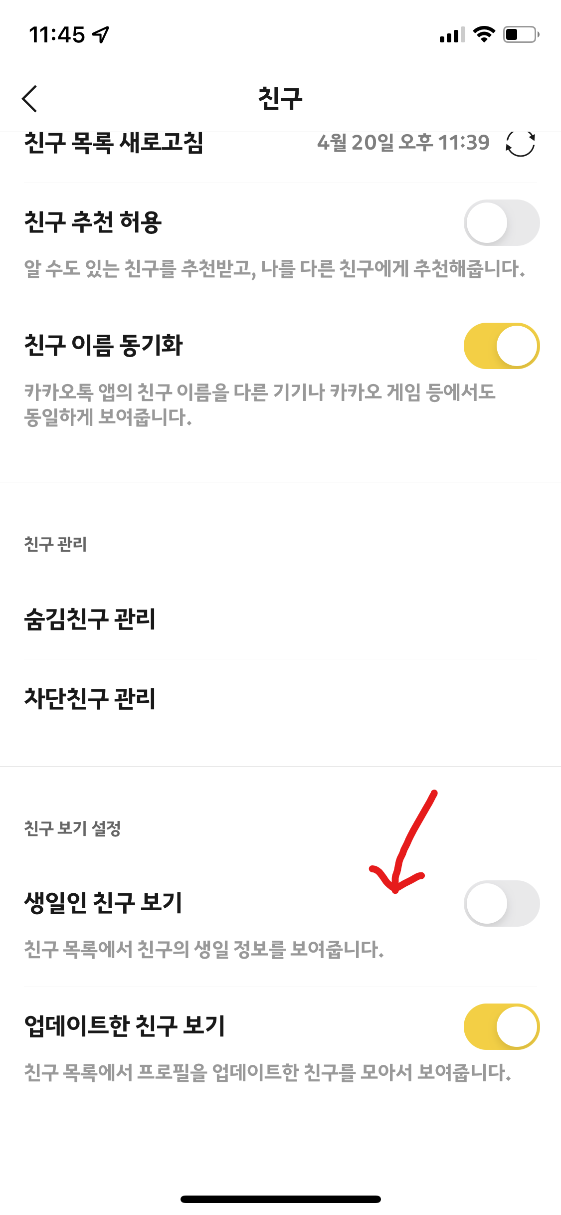 친구 탭에 들어오셨다면 하단으로 내려보시면, '친구 보기 설정'에서 '생일인 친구 보기'영역이 있습니다.