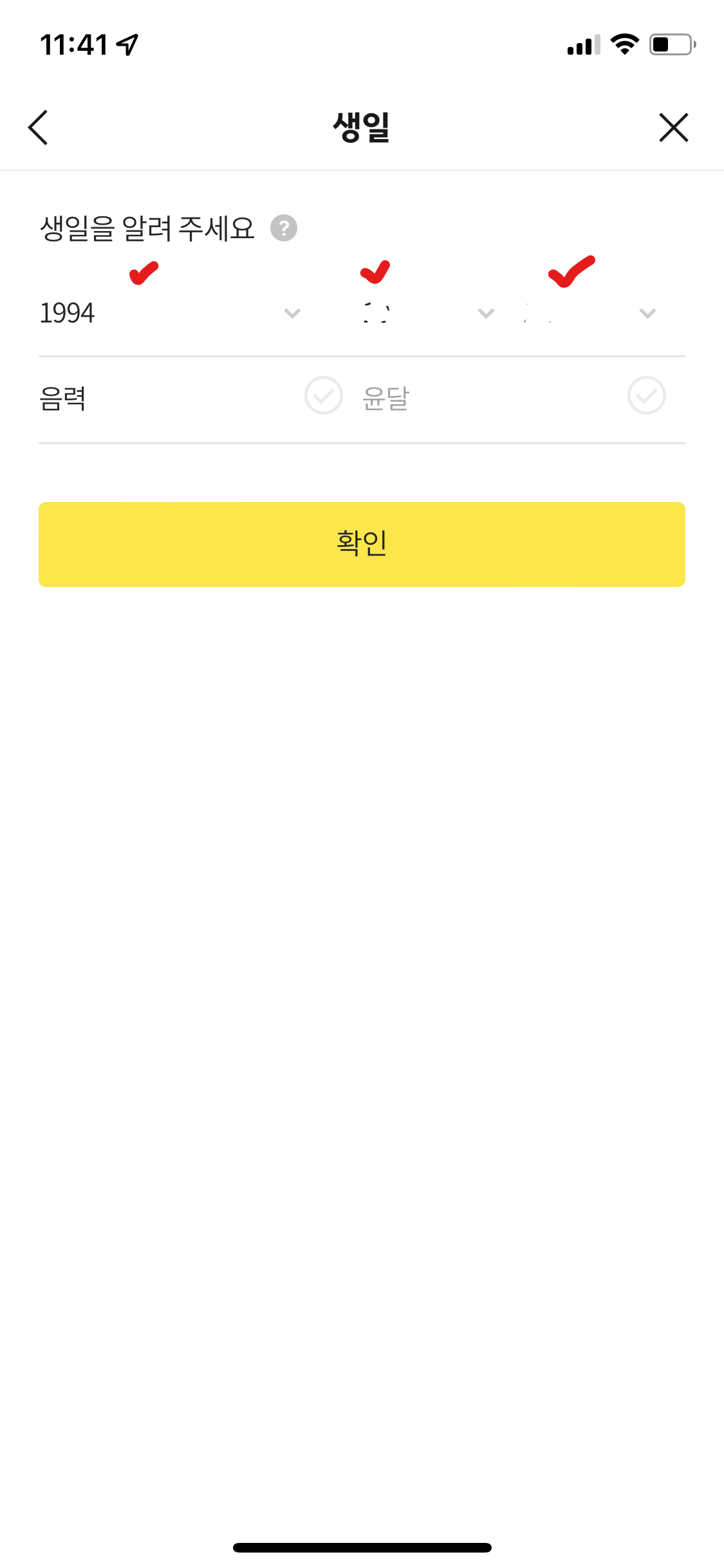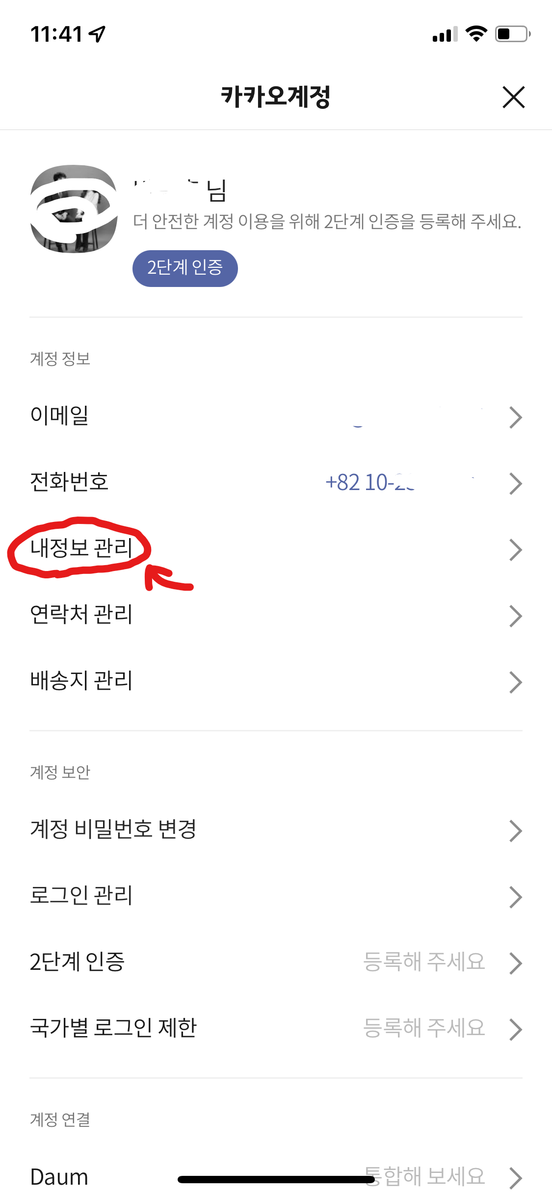 카카오 계정화면까지 잘 따라오셨다면, '내정보 관리'를 터치해주고, '생일' 영역을 터치해줍니다. 여기까지 오셨다면 다 하신겁니다!! 이제 생일만 설정해주시고, '확인' 버튼을 터치해주시면 완료가 되게 됩니다.