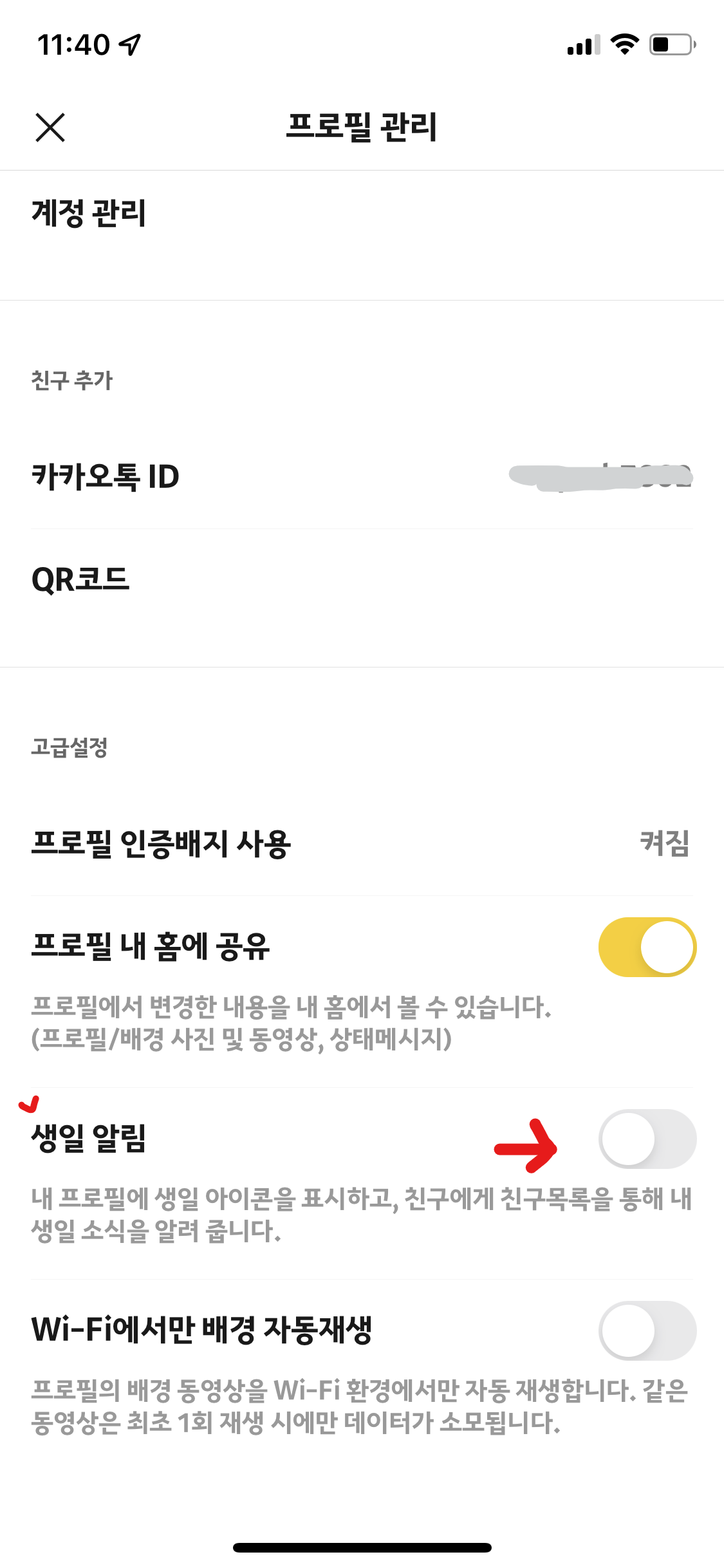 프로필 관리 탭으로 이동을 하셨다면, 하단에 있는 '생일알림' 영역에있는 스위치버튼을 통해 생일 알림을 설정하실 수 있습니다. 나의 생일을 공개하고 싶으실때는, 우측의 화면과 같이 설정해주시면 되겠습니다.