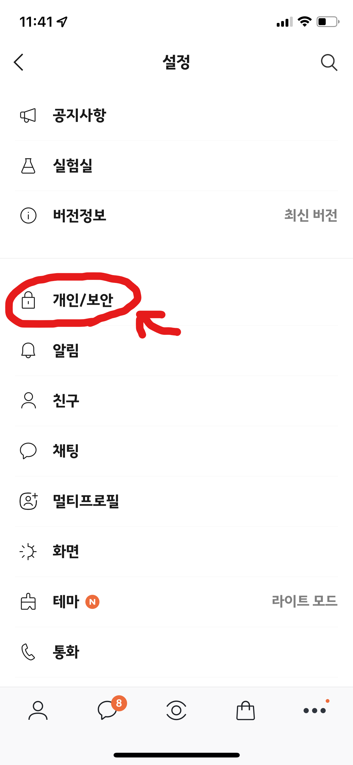 카카오톡 홈화면에서 우측하단 '더보기 아이콘'을 터치해줍니다. 더보기 탭이 열리셨다면 우측 상단에 있는 '톱니바퀴모양(설정)'을 터치해줍니다.