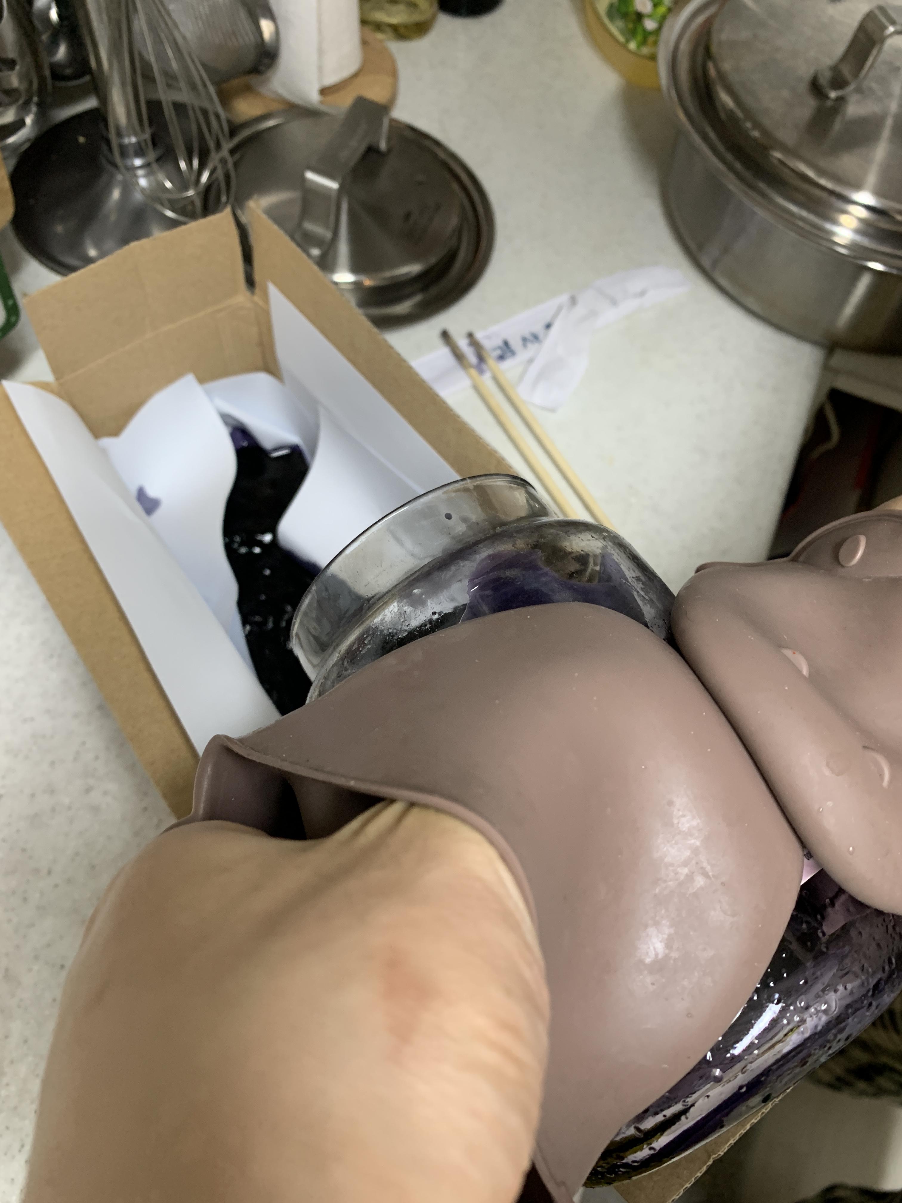 아까 준비되었던 박스 틀에 양키캔들을 부어줍니다. 저는 A4용지를 부족하게 깔았는지 금방이라도 박스가 뚫릴 것 같습니다. 그래서 후다닥 A4용지를 더 깔아주었습니다. 이 과정을 3번 정도 반복해주시면 됩니다.