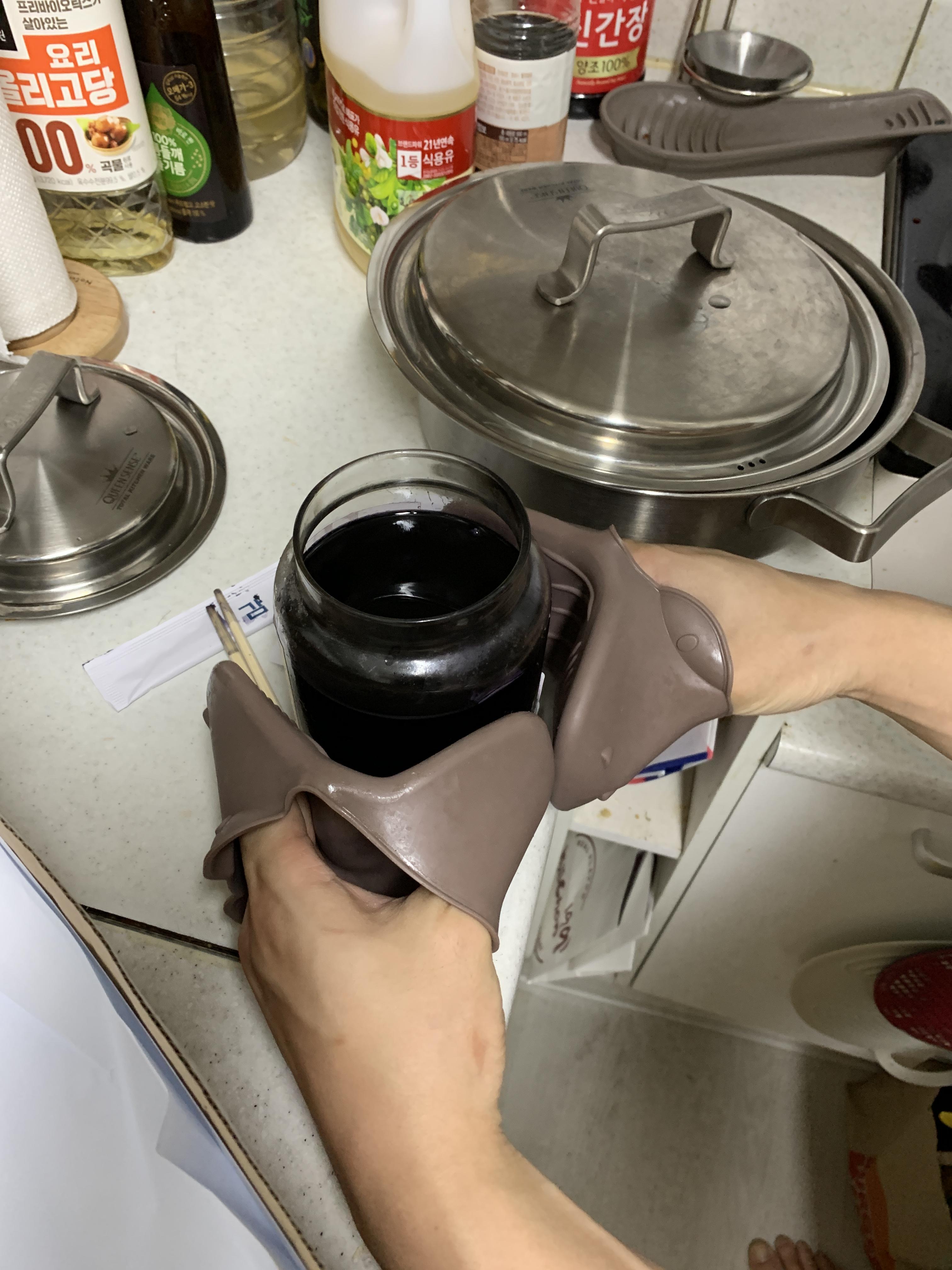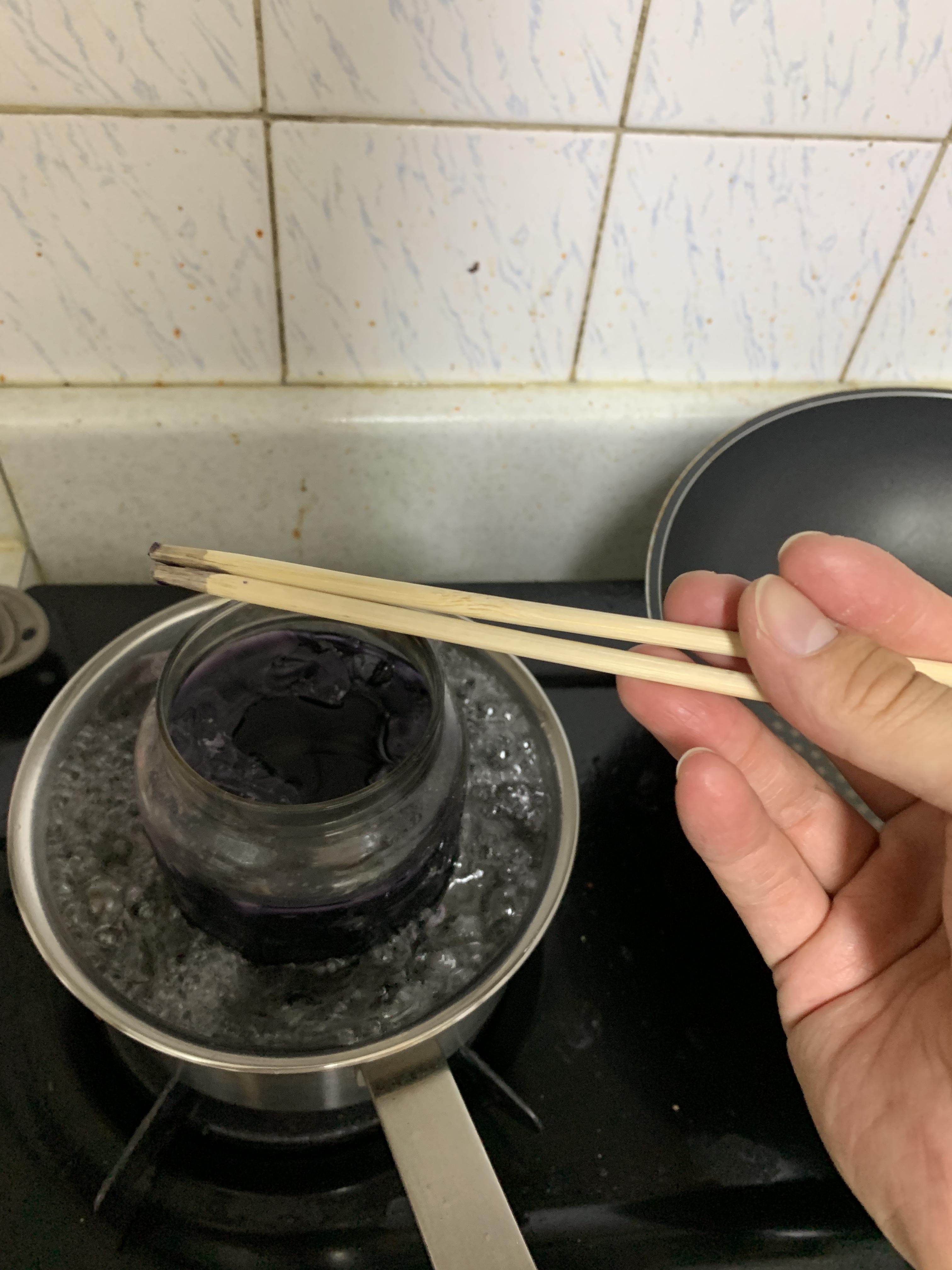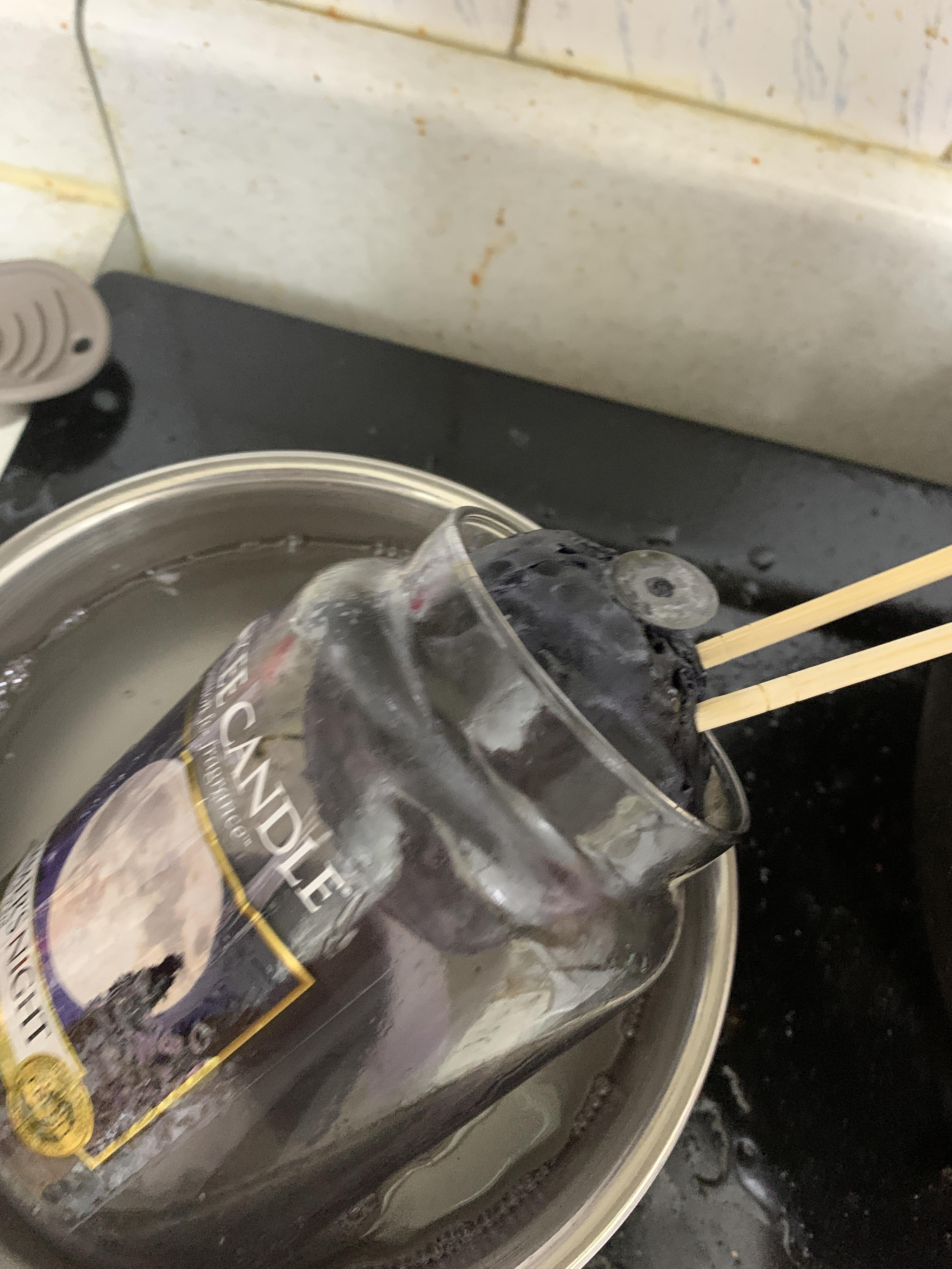 이제 캔들이 어느정도 녹았고, 캔들 병에서도 빠져나올 수 있을 정도의 크기가 되었습니다. 이제는 완전히 빼내어서 버려주도록 하겠습니다. 젓가락으로 콕 찍어서 빼내어 주었습니다.