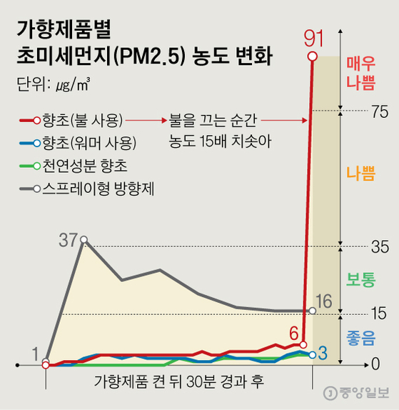 해당 통계를 살펴보면 향초에 불을 붙여서 사용하는 경우 발생되는 초미세먼지 농도를 확인하실 수 있습니다. 그렇기 때문에 우리는 향초를 사용하게 되는 경우에는 반드시 워머를 통해서만 사용하는 것이 좋습니다.