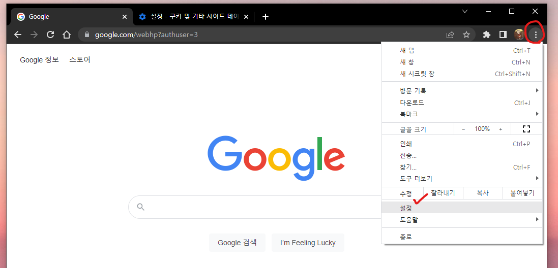 매번 번거롭게 기록을 지워야하는 불편을 없애는 방법이 있습니다. 크롬이 종료되면, 자동으로 삭제하게 해주는 방법입니다. 우측상단에 '점3개 - 설정' 선택해주세요