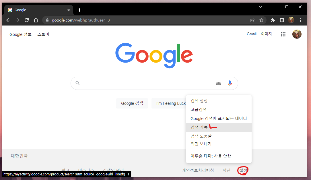 구글 메인 화면에서 우측하단을 보시면 설정이 있습니다. '설정 - 검색기록'