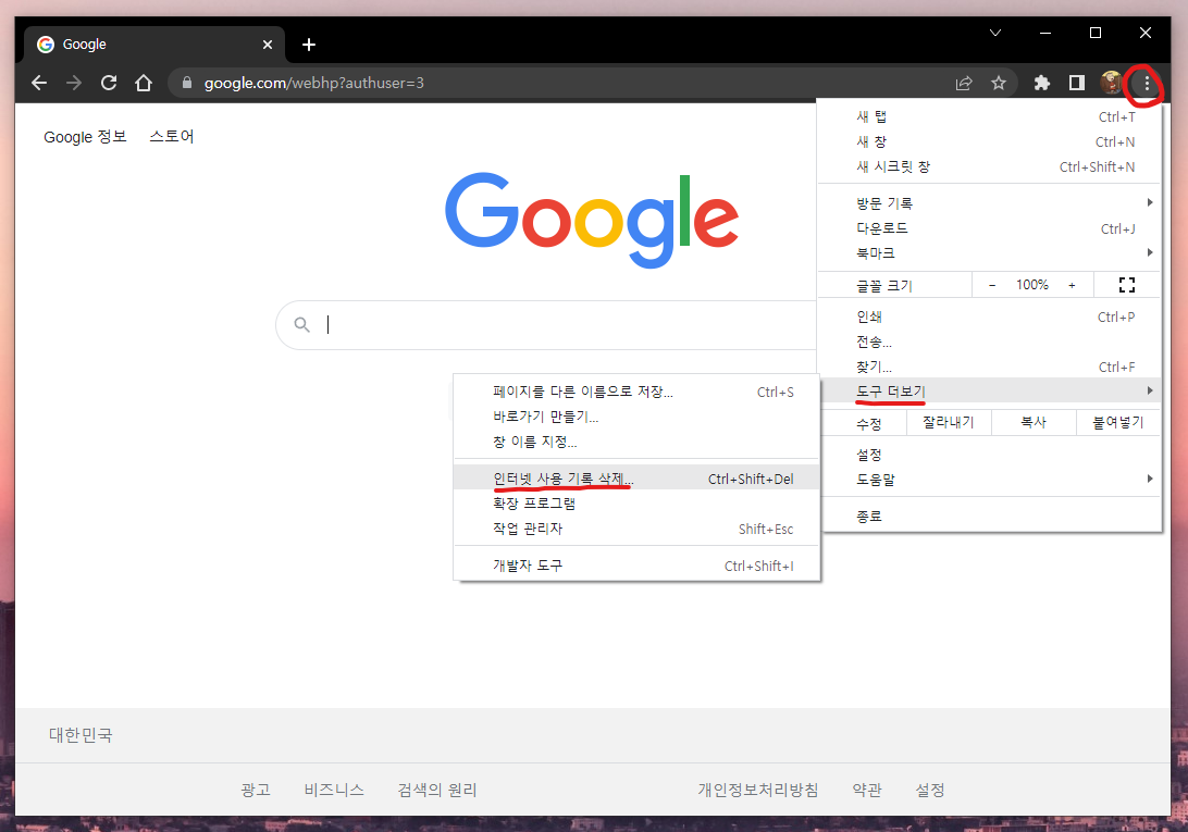크롬에서 우측 상단에 있는 '점3개 아이콘 - 도구 더보기 - 인터넷 사용 기록 삭제' 클릭해줍니다.