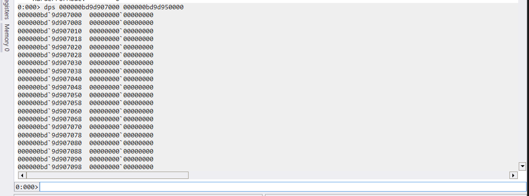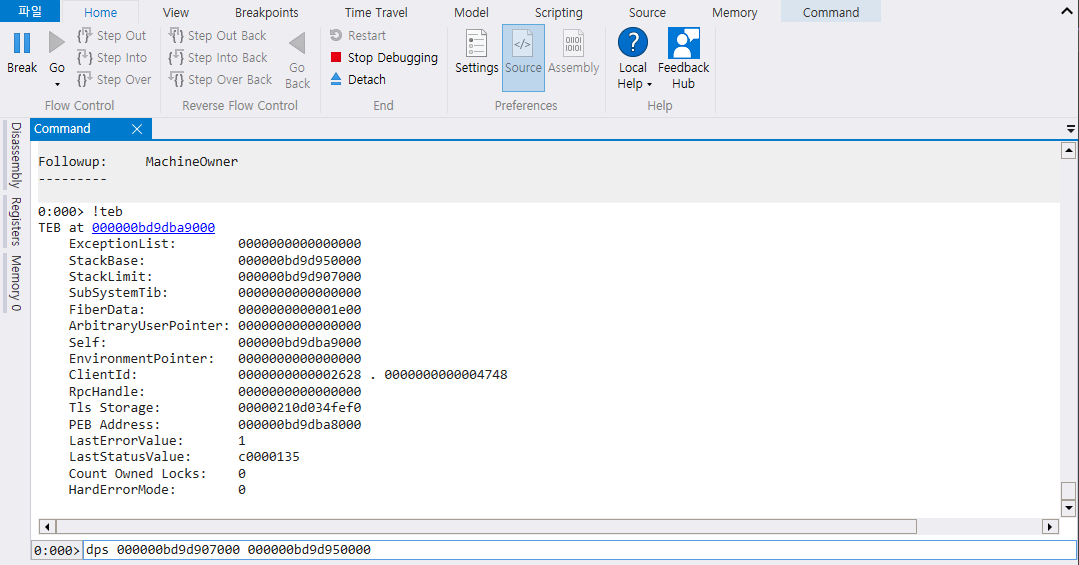 해당 명령어를 통해서 메모리를 보기 위해서는 메모리의 범위를 지정해야합니다. 내 프로세스의 메모리 범위를 보기 위해서는 !teb 명령을 통해서 확인하실 수 있습니다.
