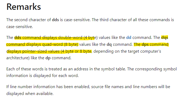 기본적으로 dds, dps, dqs 명령은 프로세스에서 지정된 범위의 메모리 내용을 표시합니다. 알아보신분들을 이미 해당 명령어는 d*s 형태로 되어있는 것을 보셨을 것 입니다. 아래 MS 공식문서에서 안내해주는 내용에 따라면 d, q, p 값을 각각 프로세스 환경에 따라서 적절히 맞춰서 사용해야합니다.