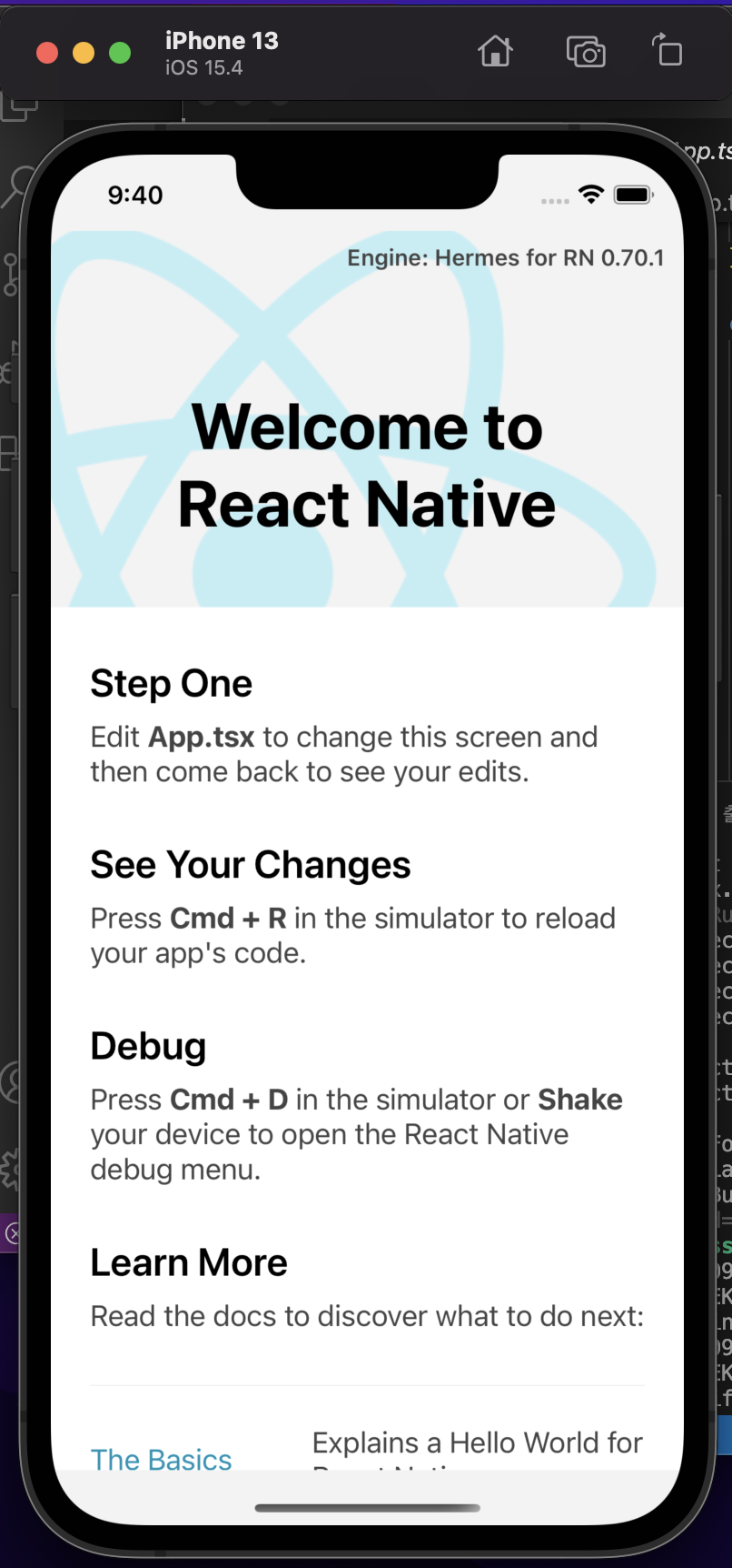 아래와 같은 화면이 나타나면 성공적으로 리액트네이티브 ios 빌드는 된 것입니다.
