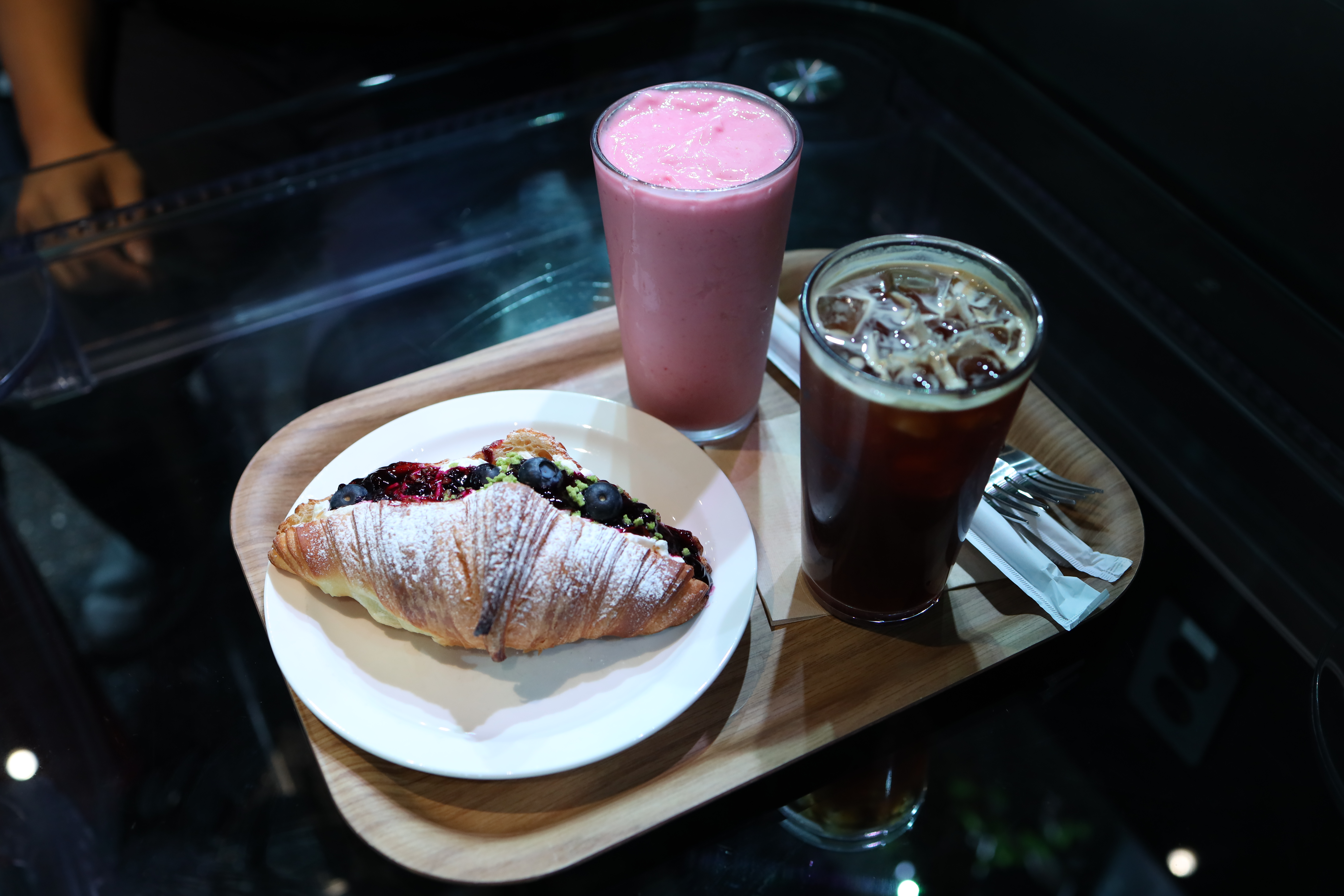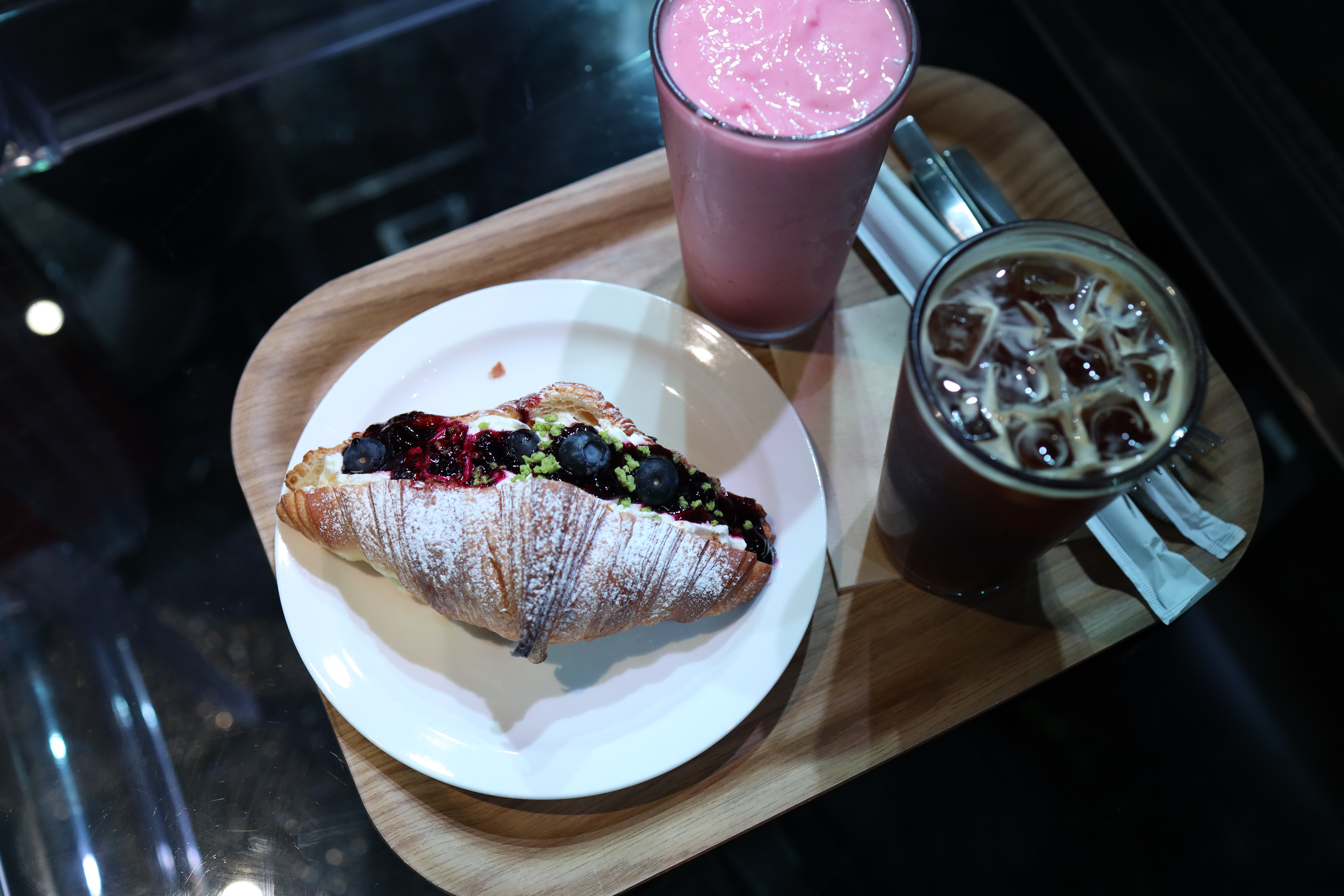 아쿠아리움 카페라서 카페는 그렇게 기대는 하지 않았지만, 생각보다 높은 퀄리티의 메뉴들이 많이 있었습니다. 저는 같이 간 동생과 아메리카노 1개, 블루베리요거트스무디 1개, 과일크로와상 1개를 주문했습니다.