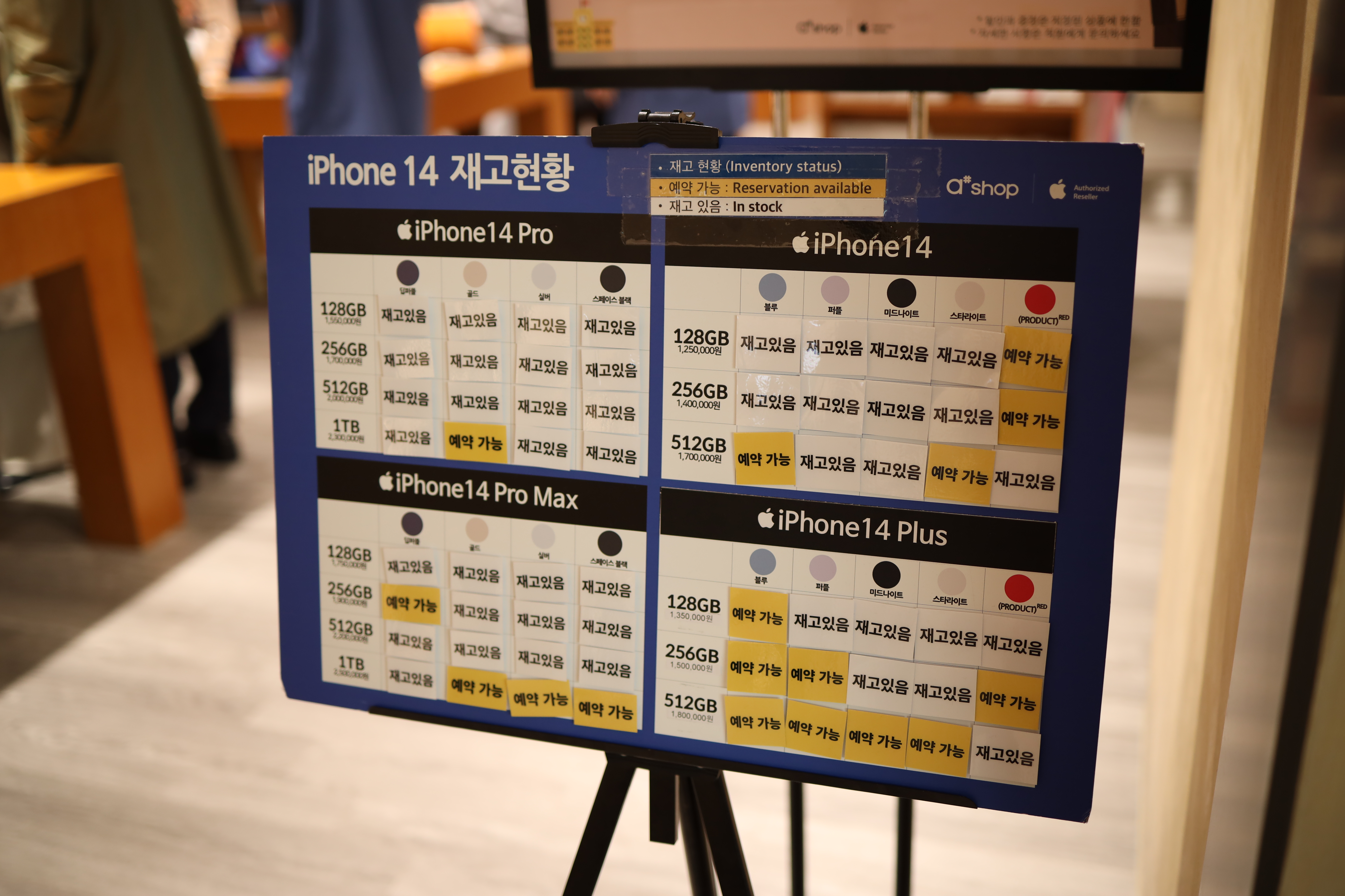 애플 매장 입구에는 최근에 출시했던 iPhone14의 현재 있는 재고에 대한 안내판이 있었습니다. 그닥 인기가 없었던 이번 라인업이라서 재고는 많이 있는 것 같습니다😅