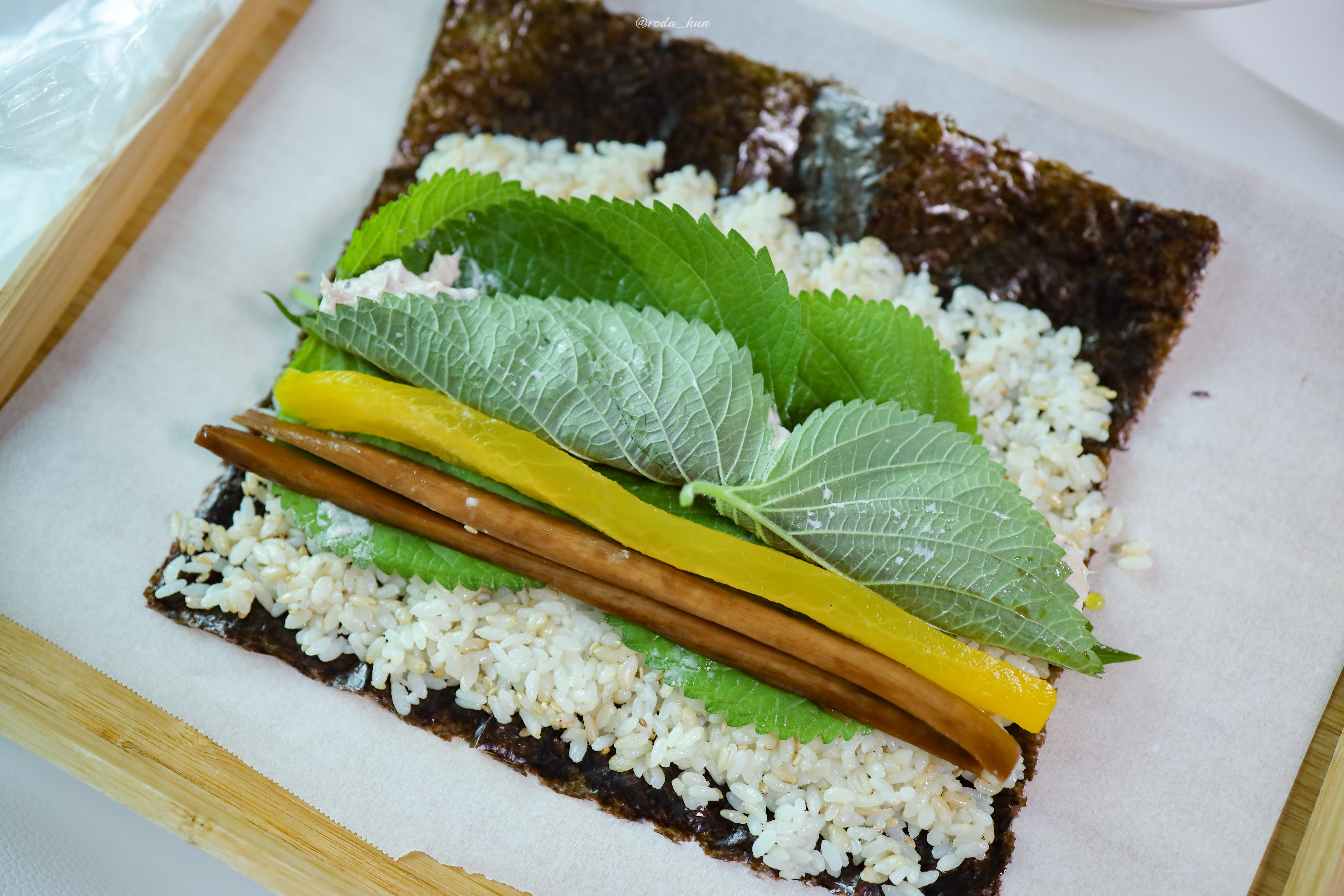 📌필요한 재료 : 김밥김, 참치, 담무지, 우엉, 시금치, 깻잎, 쌀, 참기름, 통깨, 참치액, 후추, 마요네즈
