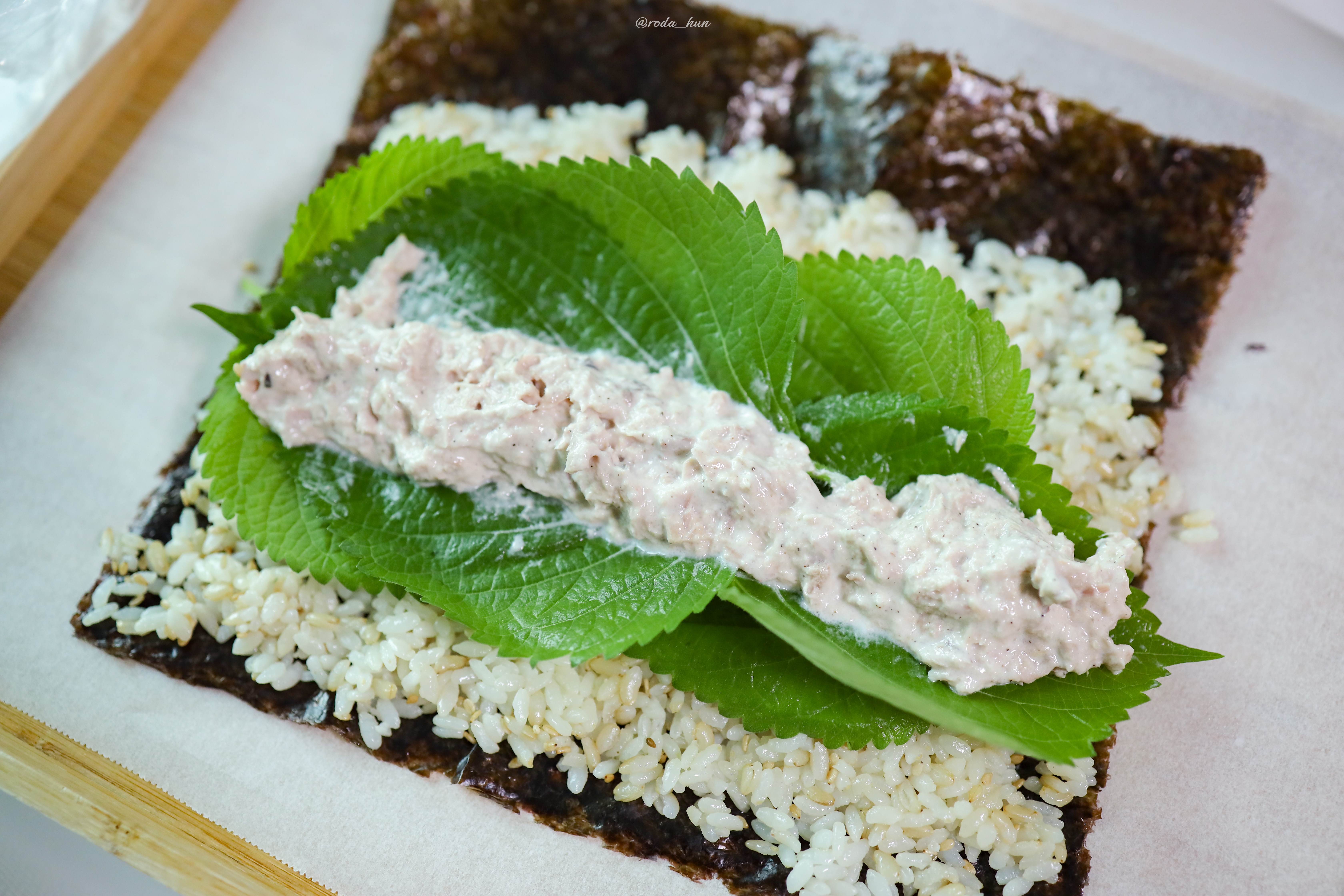 깻잎을 밥위에 깔아주고, 참치를 올려줍니다.