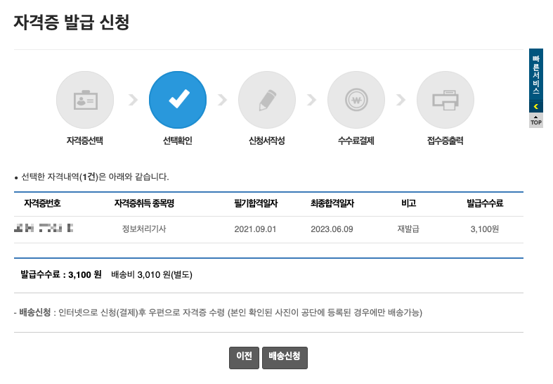 2023년 1회 정보처리기사 실기를 합격하고, 실물자격증을 신청하여 수령받았습니다. 2021년에 정보처리기사 필기를 취득하고, 계속 미루고미루다가, 정보처리기사 실기를 2번 탈락하고, 정신차리고 공부해서 3번만에 합격을 받았습니다. 여러 바쁜일이 많은 와중에 합격하게 되어 개인적으로는 상당히 뜻깊은 자격증인 것 같습니다.