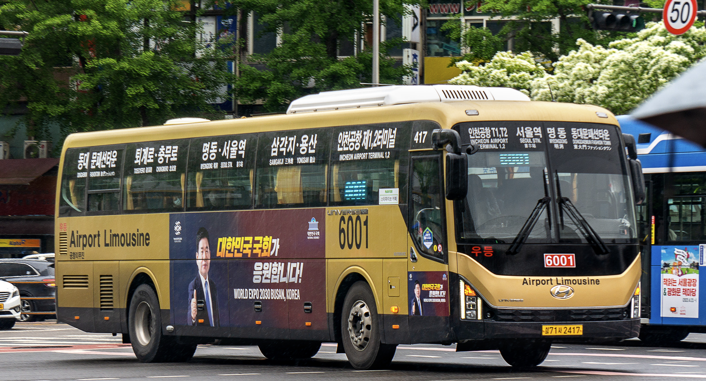 서울에서 인천국제공항을 가는 6001번 버스는 황금색의 디자인으로 만들어진 대형리무진버스입니다. 공항리무진에서 운영하고 있습니다.
