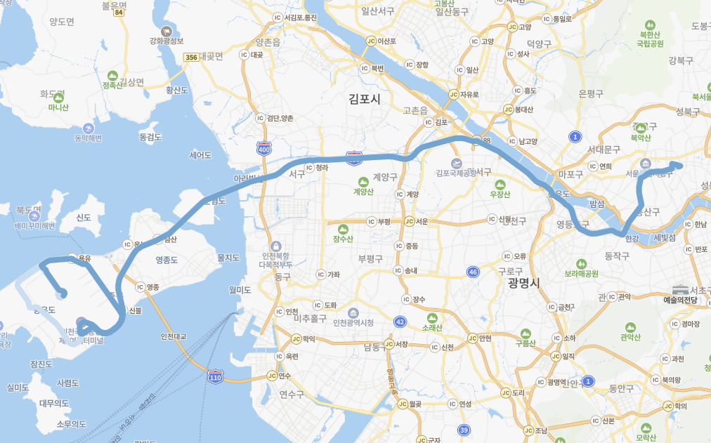 인천공항 2터미널 -> 인천공항1터미널 -> 한강대교북단 -> 신용산역 -> 용산우체국 -> 삼각지역 -> 숙대입구역 -> 포포인치호텔, 갈월동 -> 서울역(서울스퀘어 앞) -> 회현역(남대문시장) -> 명동역 -> 퇴계로3가(한옥마을) -> 충무로역 -> 베이튼호텔