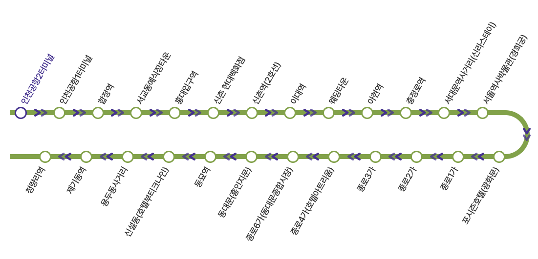인천공항 2터미널 -> 인천공항1터미널 -> 합정역 -> 서교동 예식장타운 -> 홍대입구역 -> 신촌 현대백화점 -> 신촌역(2호선) -> 이대역 -> 웨딩타운 -> 아현역 -> 충정로역 -> 서대문역사거리(신라스테이) -> 서울역사박물관(경희궁) -> 포시즌호텔(광화문) -> 종로1가 -> 종로2가 -> 종로3가 -> 종로4가(호텔아트리움) -> 종로6가(동대문종합시장) -> 동대문(흥인지문) -> 동묘역 -> 신설동역(호텔부티크나인) -> 용두동사거리 -> 제기동역 -> 청량리역