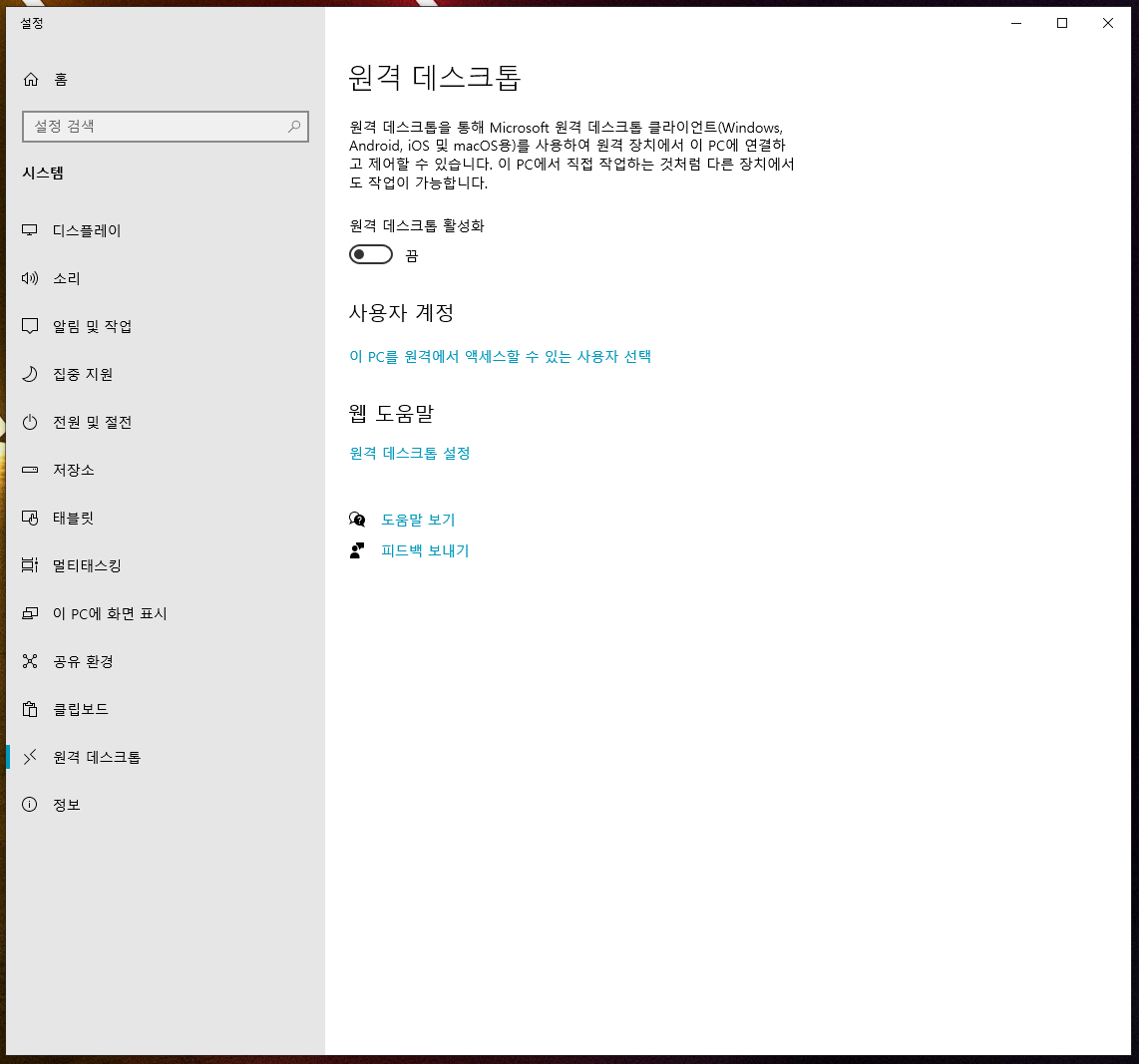 - 접속하려는 대상자의 PC에 RDP가 활성화 되어있는지 확인