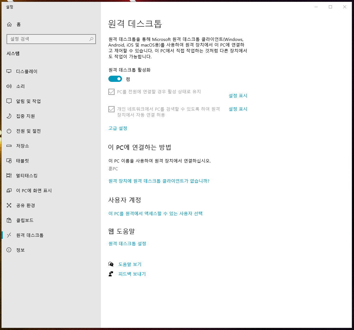 윈도우 검색에서 '원격 데스크톱 설정'이라고 입력하신 뒤에 설정을 들어갑니다