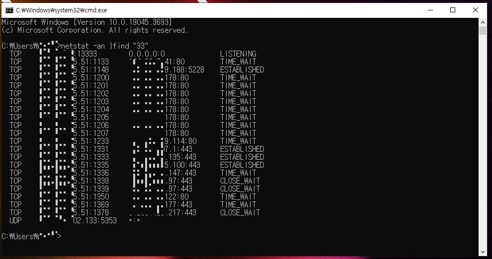 우선 내 컴퓨터에서 RDP가 동작하고 있는지 한번 포트를 확인해보겠습니다. 윈도우+R 을 눌러서 cmd 창을 열어주신 다음에, 아래의 명령어를 입력해주세요. RDP의 기본포트는 3389입니다. 저는 편의상 33이 들어간 포트를 검색해보겠습니다.