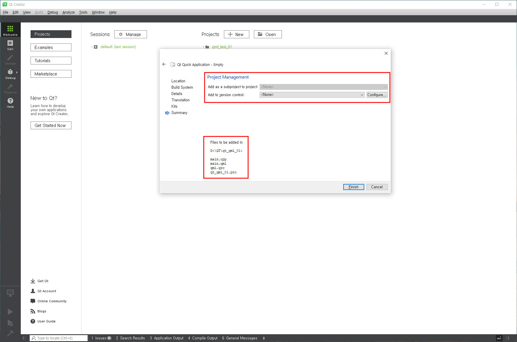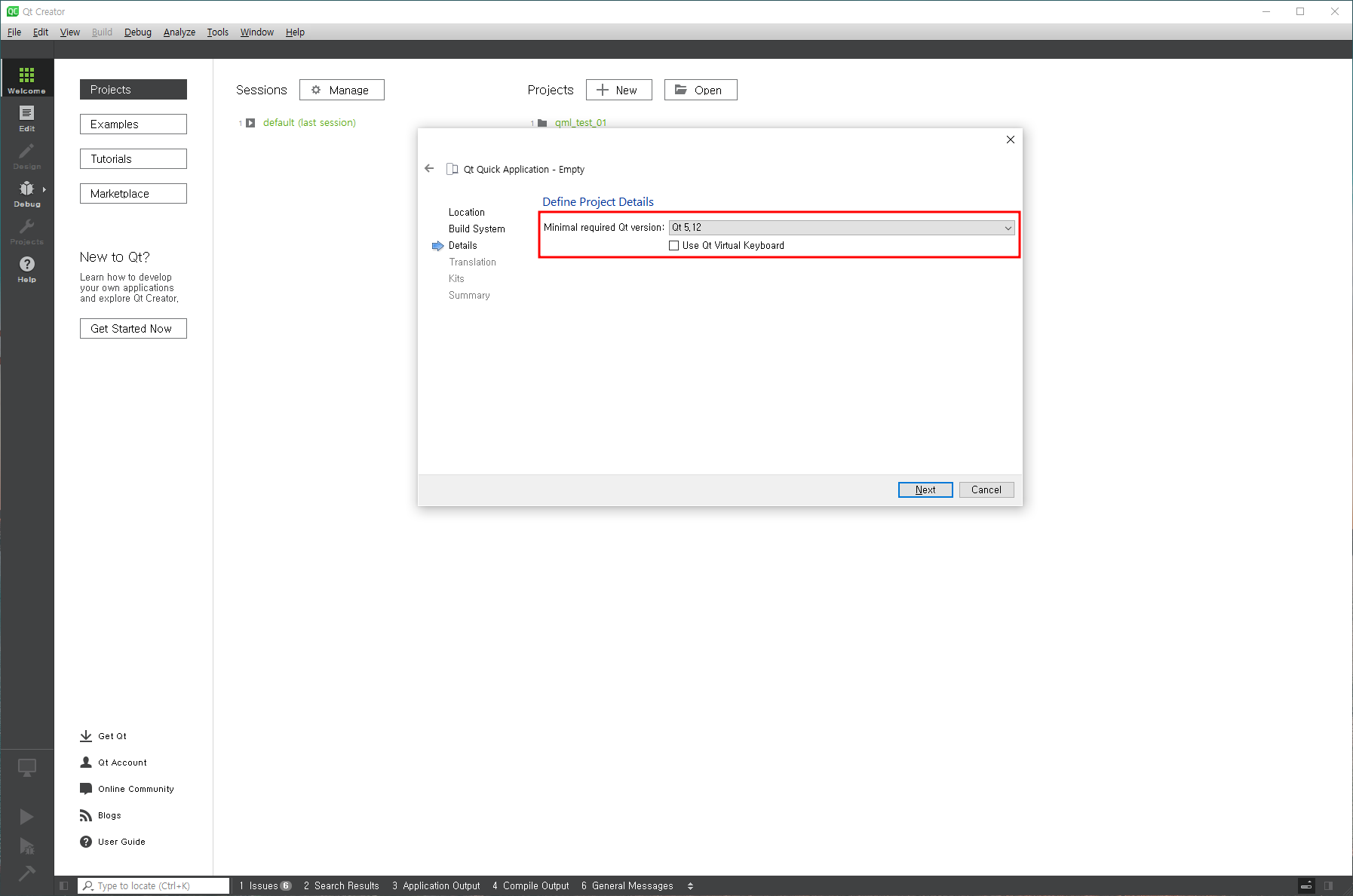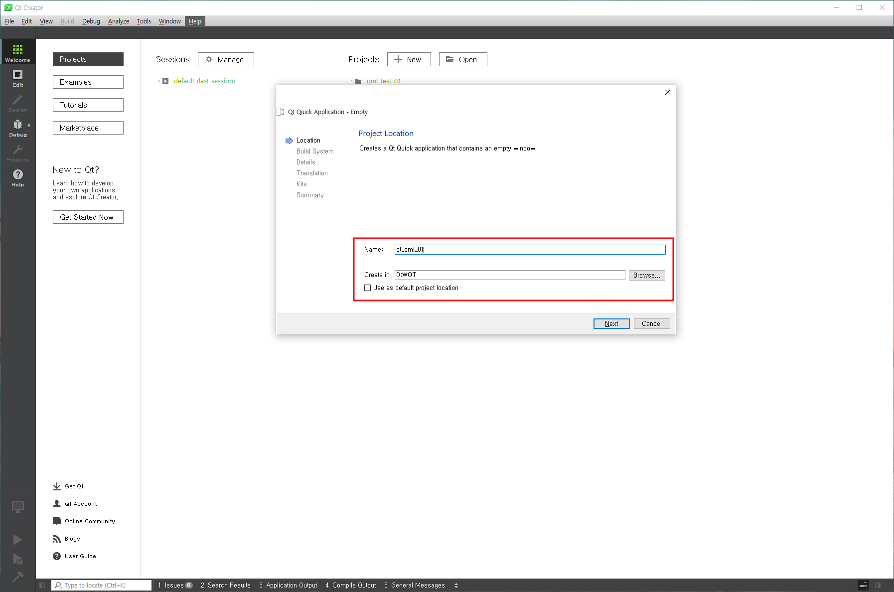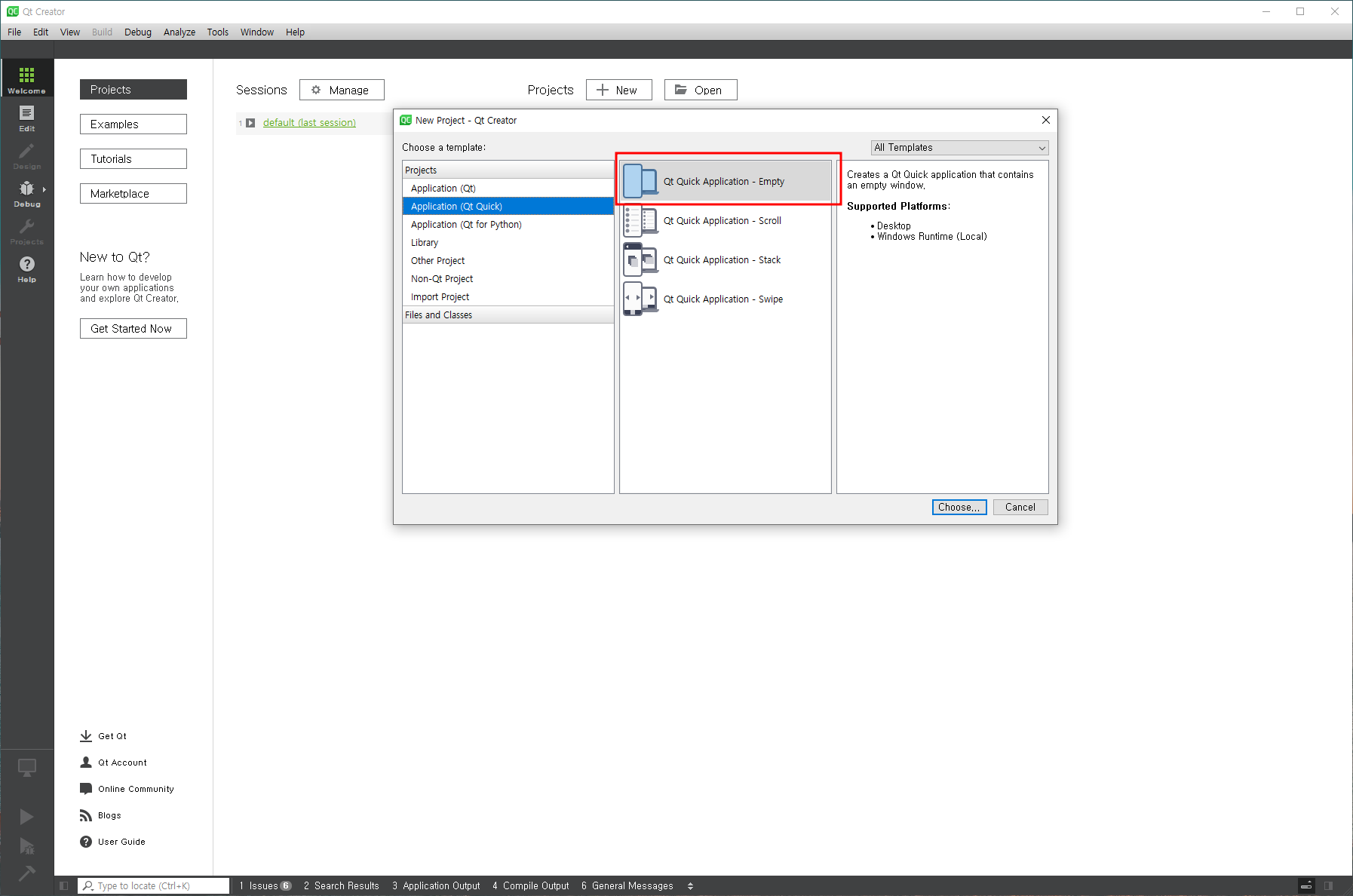 - Qt Quick Application - Empty를 선택하여 프로젝트를 생성합니다.